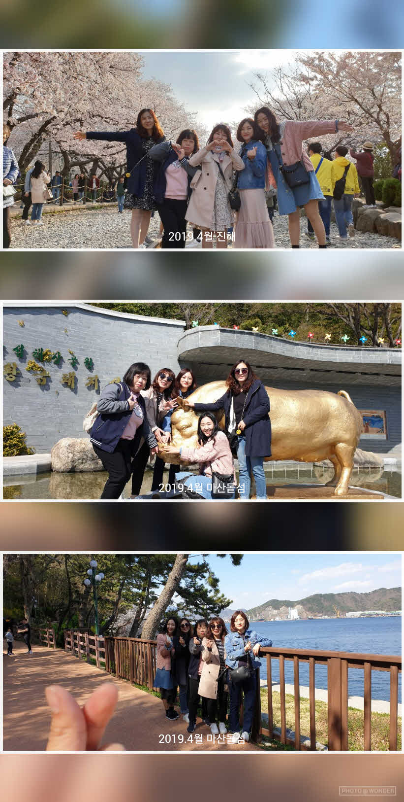 봄.가을 일년에 두번정도 여행자클럽을 통해 그녀들은 여행을 떠난다 조용하고 편하고 가이드도 넘 친절하다 이번 장정웅 가이드도 유머와재치가 있어 좋았다 봄의 끝자락에 벚꽃도 이뿌고 차가운 봄바람의 바닷길 돝섬도 힐링하기에 최고였다 많이 웃고 떠들고 고딩졸업이후 처음만난 진해친구도 반가웠다 다음번에도 여행도 떠나고 친구도 만날수있는 여행자클럽을 이용할 생각이다