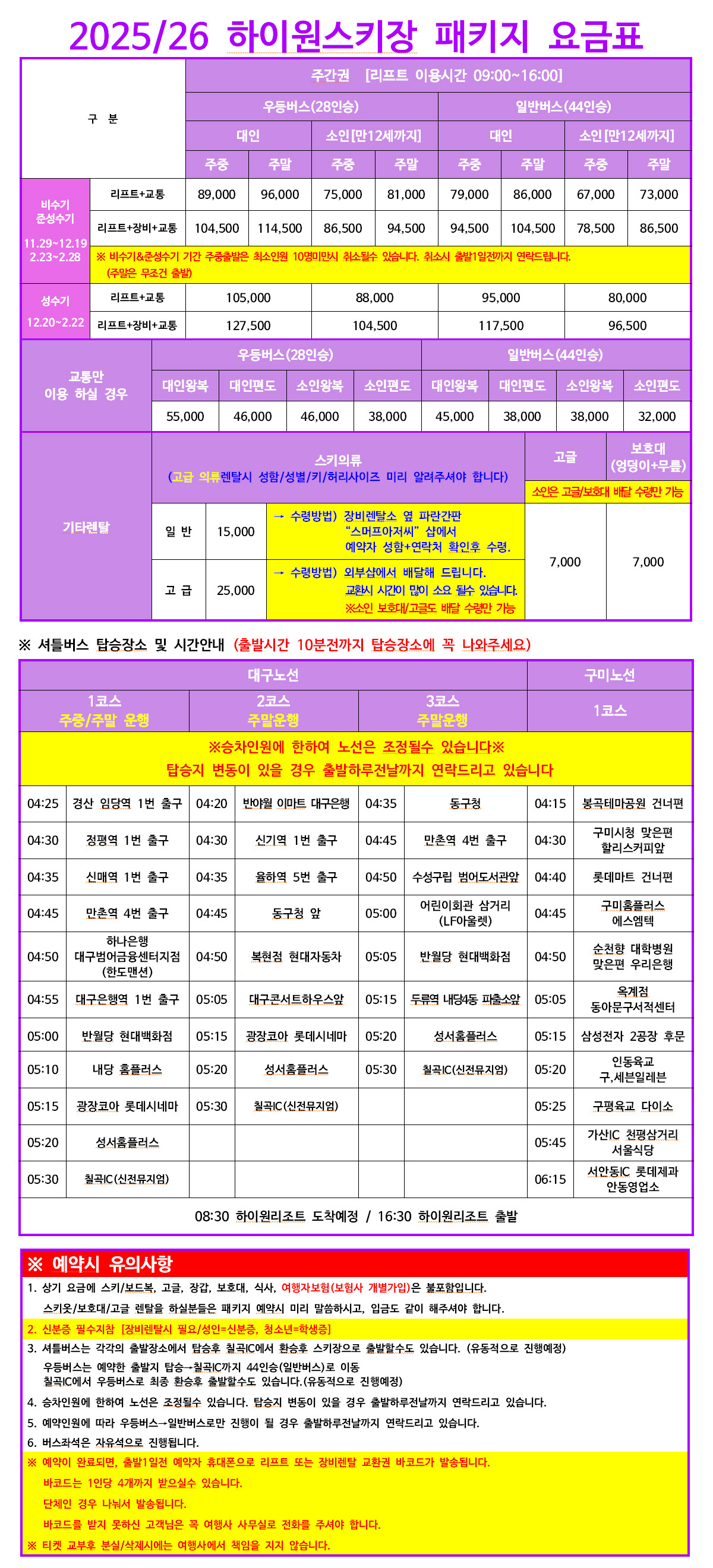 - 신분증 지참(스키&보드 장비 렌탈시 필요합니다)