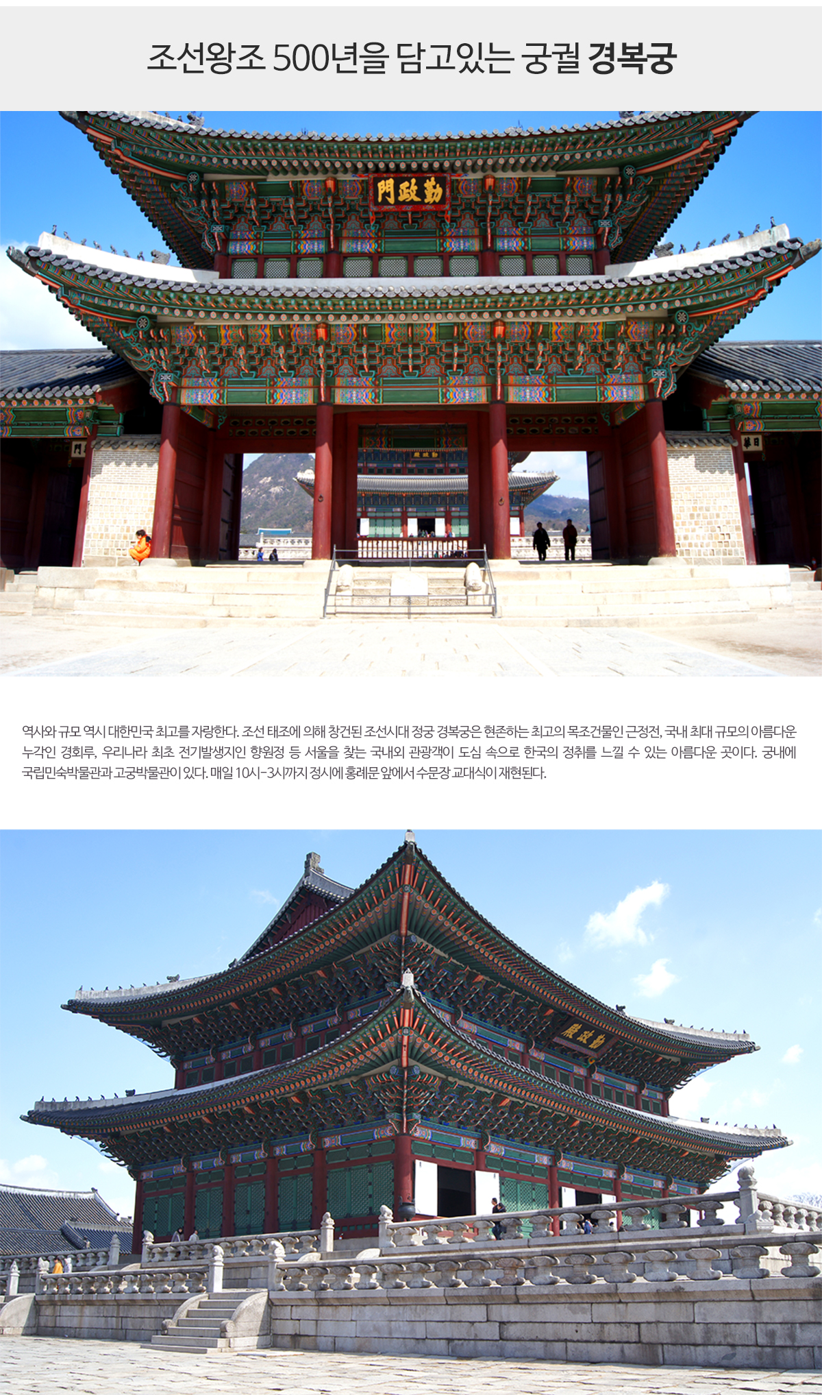 - 하루에 한번 흥례문 앞 수문장 교대식이 재현되니, 놓치지 마세요.
