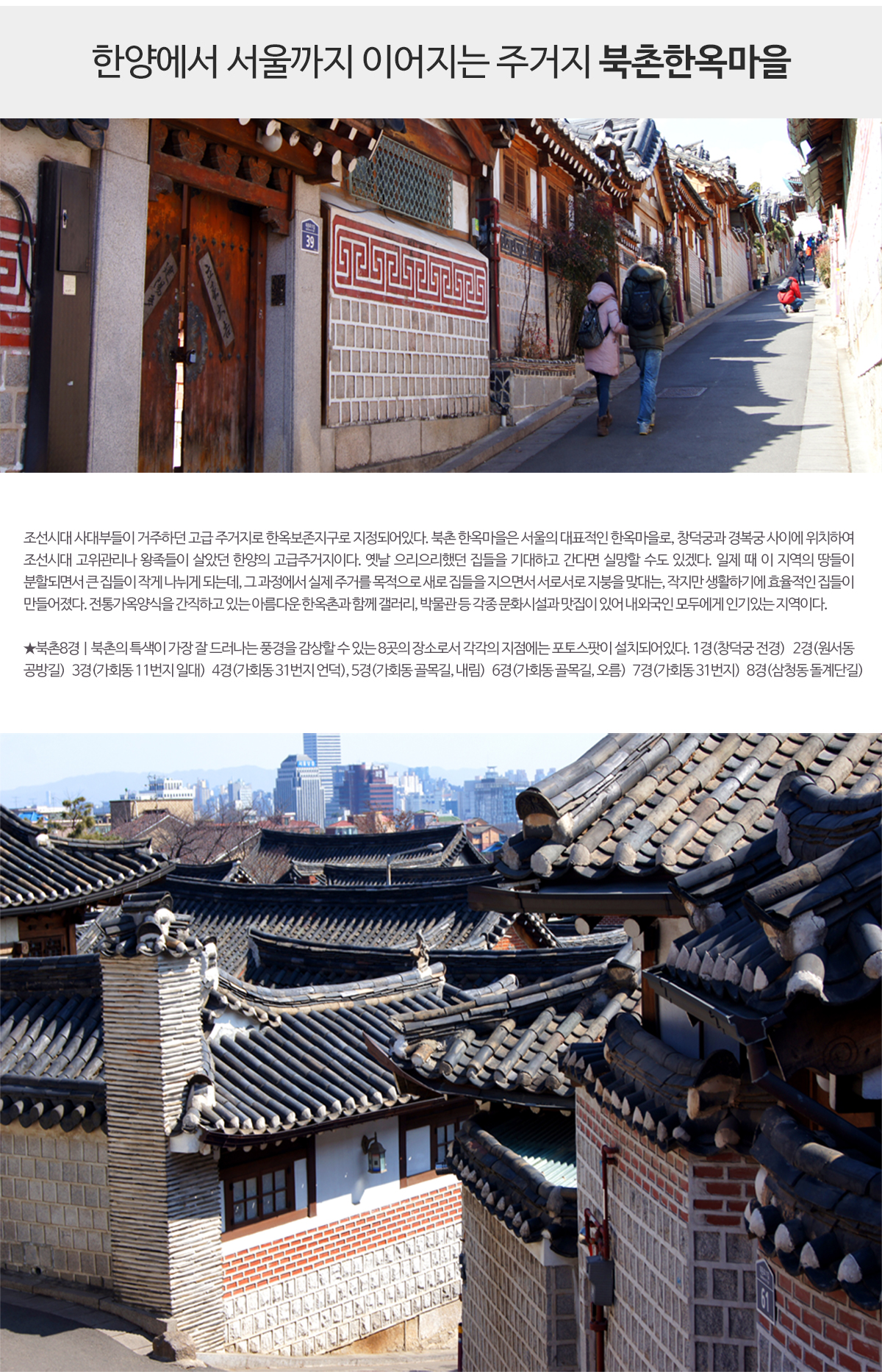- 북촌의 특색 있는 풍경을 감상할 수 있는 북촌8경 각 지점 포토 스팟에서 사진찍기