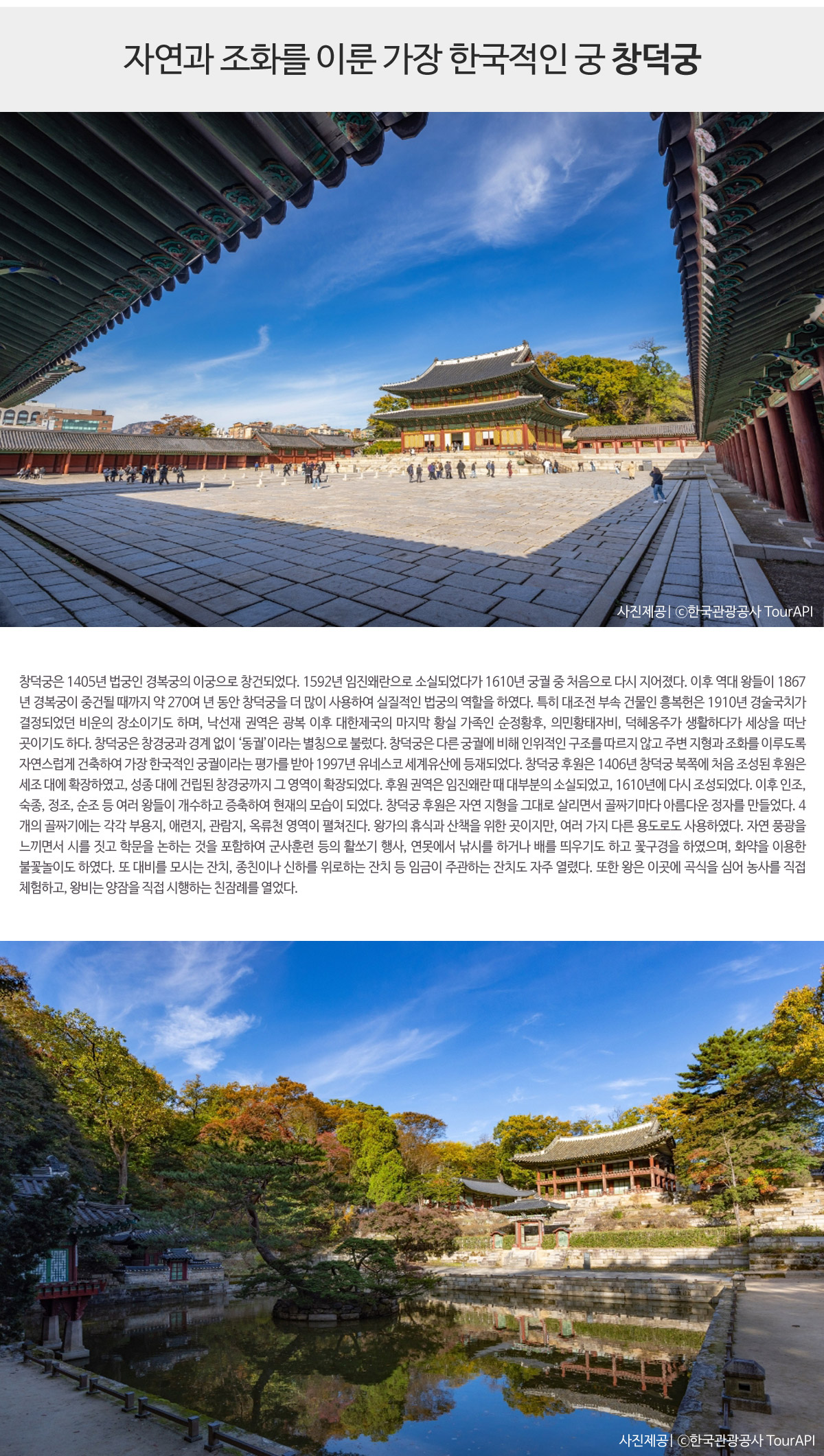 - 다른 궁궐에 비해 인위적인 구조를 따르지 않고 주변 지형과 조화를 이루어 가장 한국적인 궁궐이라는 평가!